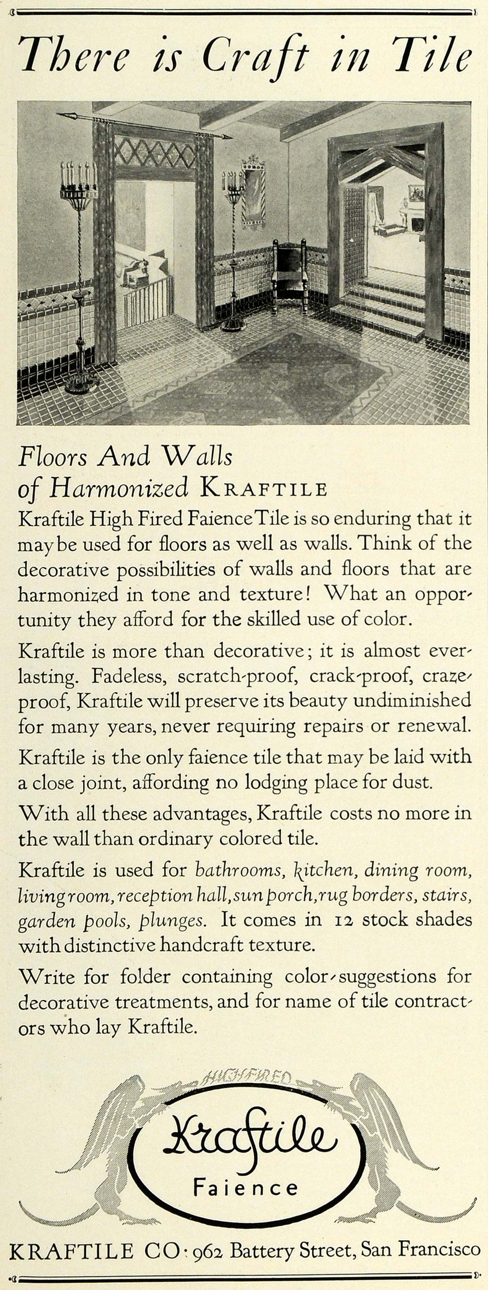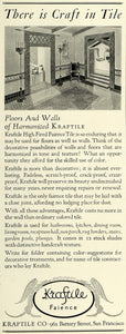 This is an original 1927 black and white print ad for the Kraftile Company of 962 Battery Street in San Francisco. This ad features their tiles for floors and walls for home decoration and improvement.