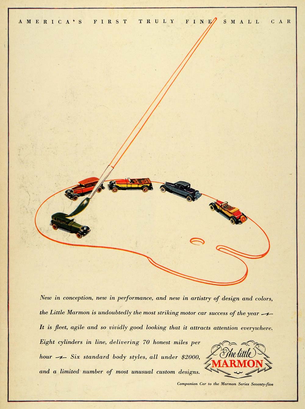 This is an original 1927 color print ad for little Marmon automobiles. The vehicles came in six styles, and were priced under $2000.