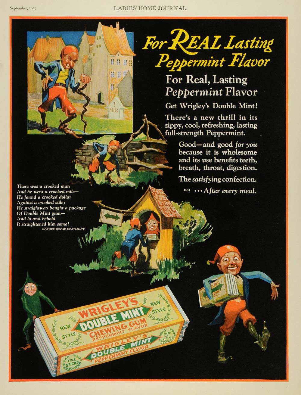 This is an original 1927 color print ad for Wrigley's Double Mint Chewing Gum in Peppermint flavor. This ad features the Crooked Man from Mother Goose and the Wrigley's Spearman.