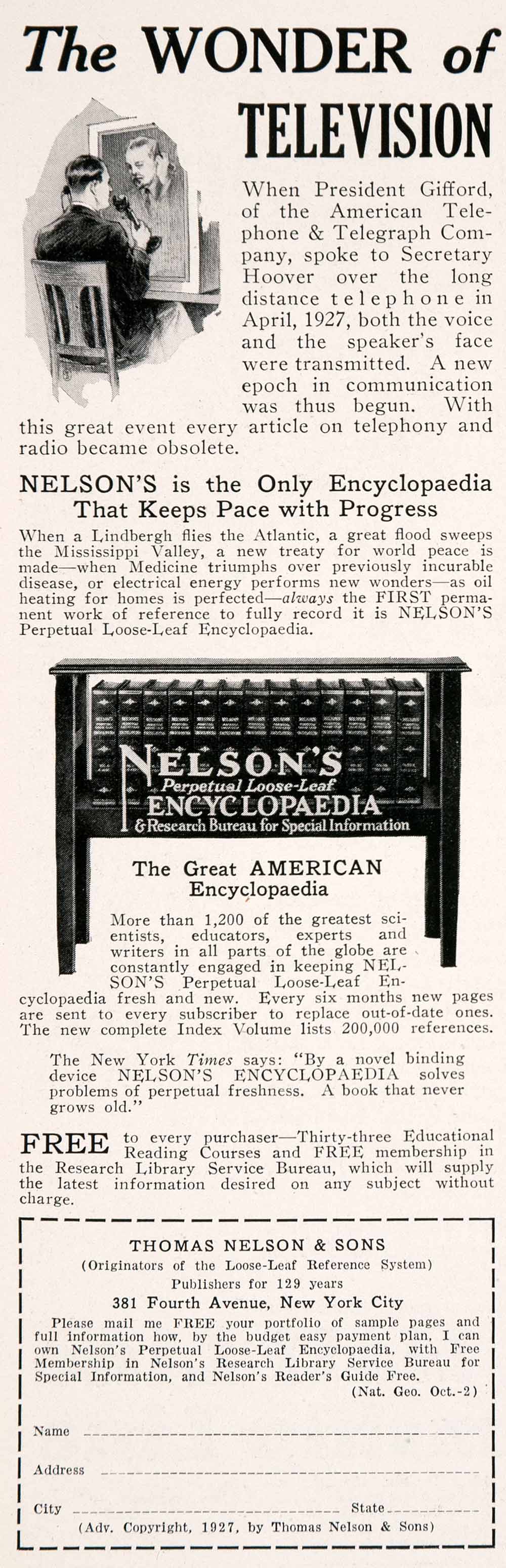 This is a small original 1927 black and white print ad for Nelson's Encyclopedia from Thomas Nelson & Sons. The ad discusses President Gifford of the American Telephone & Telegraph Company, Lindbergh, and Secretary Hoover.