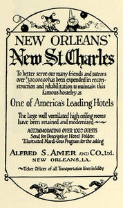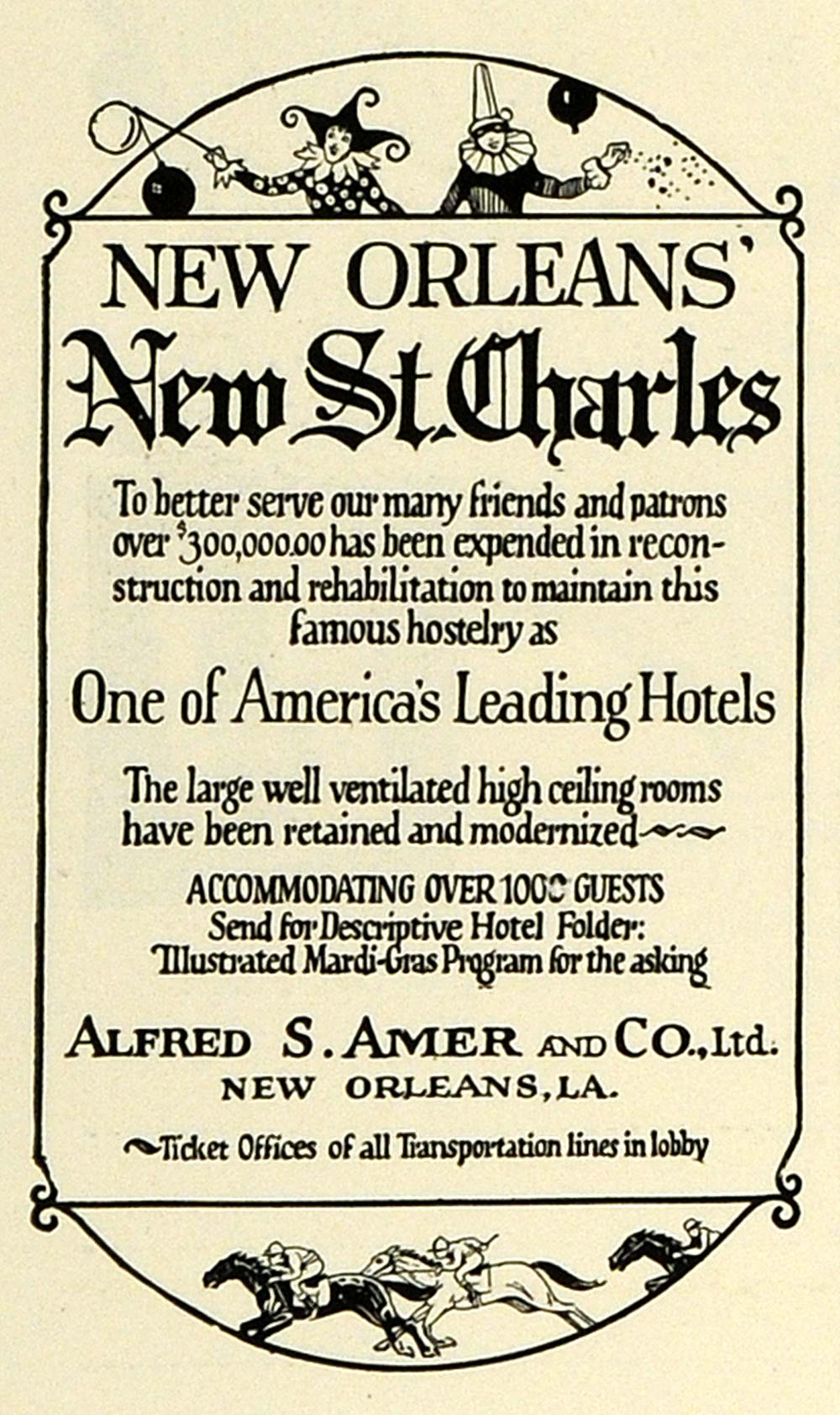 This is an original 1927 black and white print ad for New Orleans' New St. Charles Hotel.