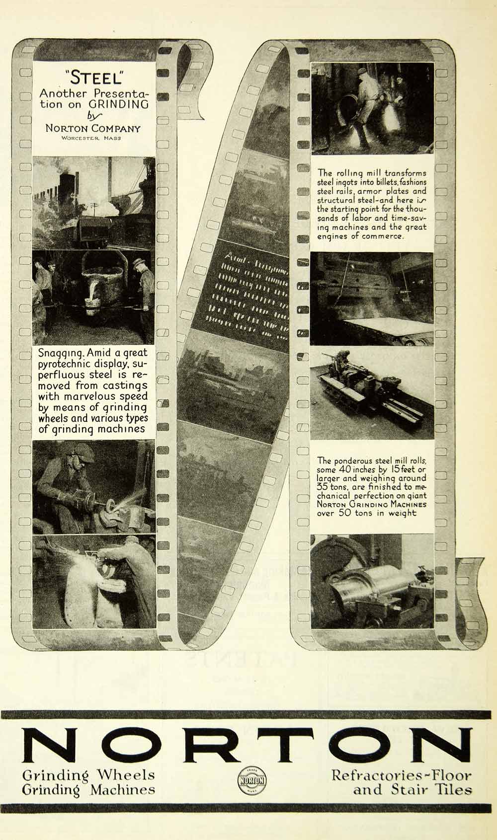 This is an original 1927 black and white print ad for grinding machinery and equipment by the Norton Company of Worcester, Massachusetts.