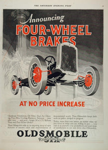 This is an original 1927 two-color print ad for Oldsmobile automobiles, now with four-wheel brakes at no price increase.
