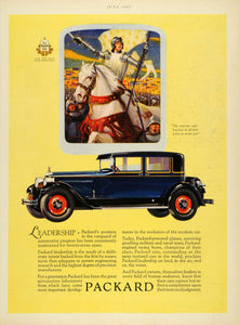 This is an original 1927 color print ad for Packard automobiles. Shown in the illustration is an image of Joan of Arc riding on her horse and guiding the French army during the Hundred Years War.