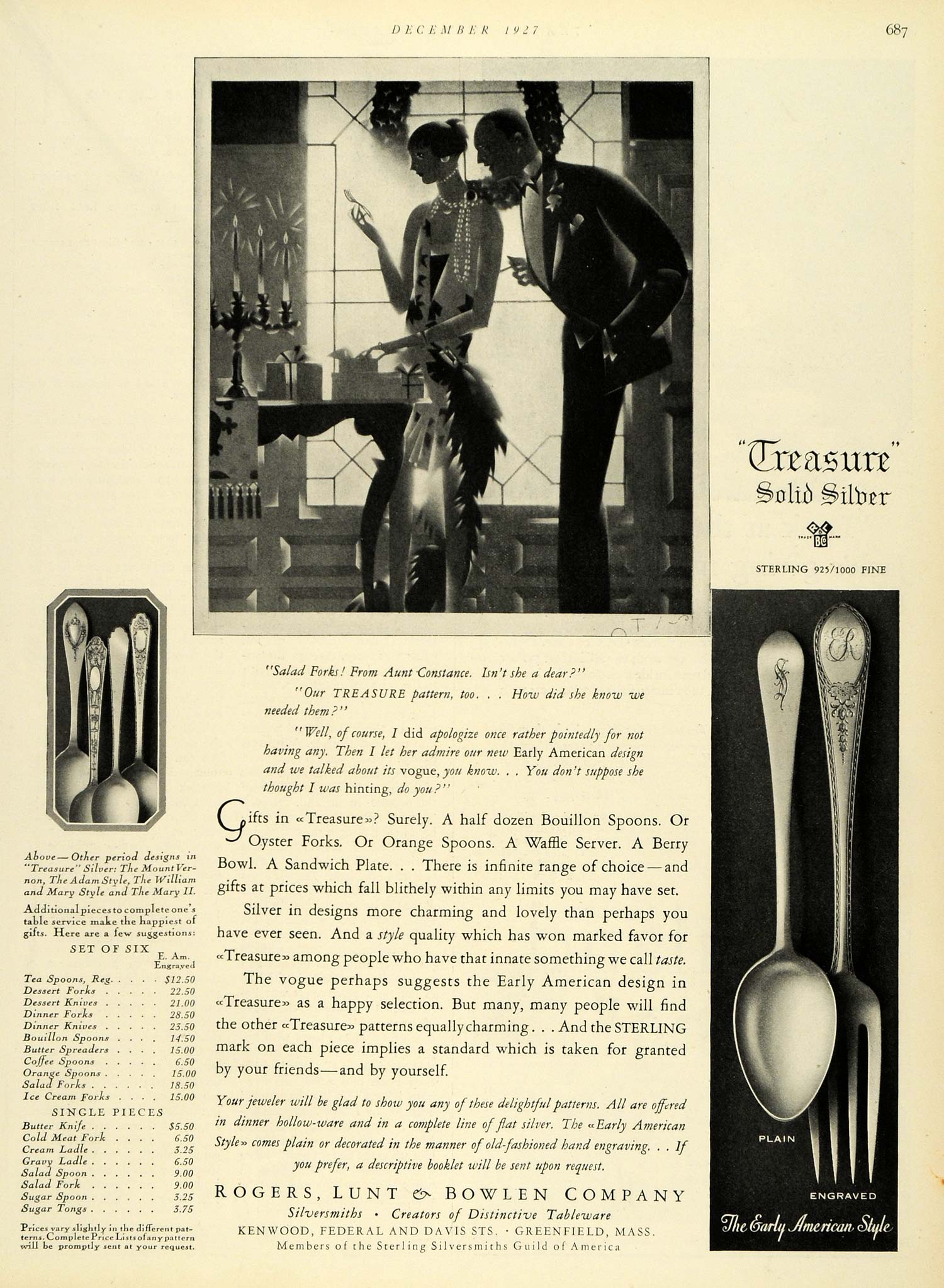 This is an original 1927 black and white print ad for silverware from the Rogers, Lunt & Bowlen Company of Greenfield, Massachusetts. Shown in the illustration is a couple appreciating the flatware. Also shown are the plain and engraved American styles.