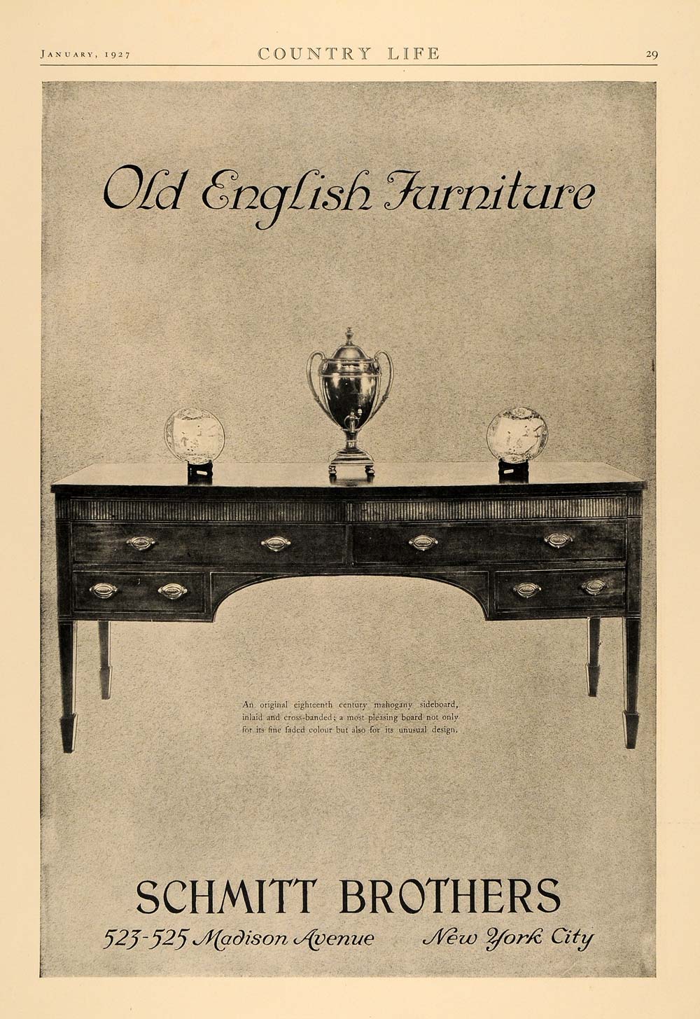 This is an original 1927 black and white print ad for Schmitt Brothers' Old English Furniture, specially featuring an 18th Century mahogany sideboard.
