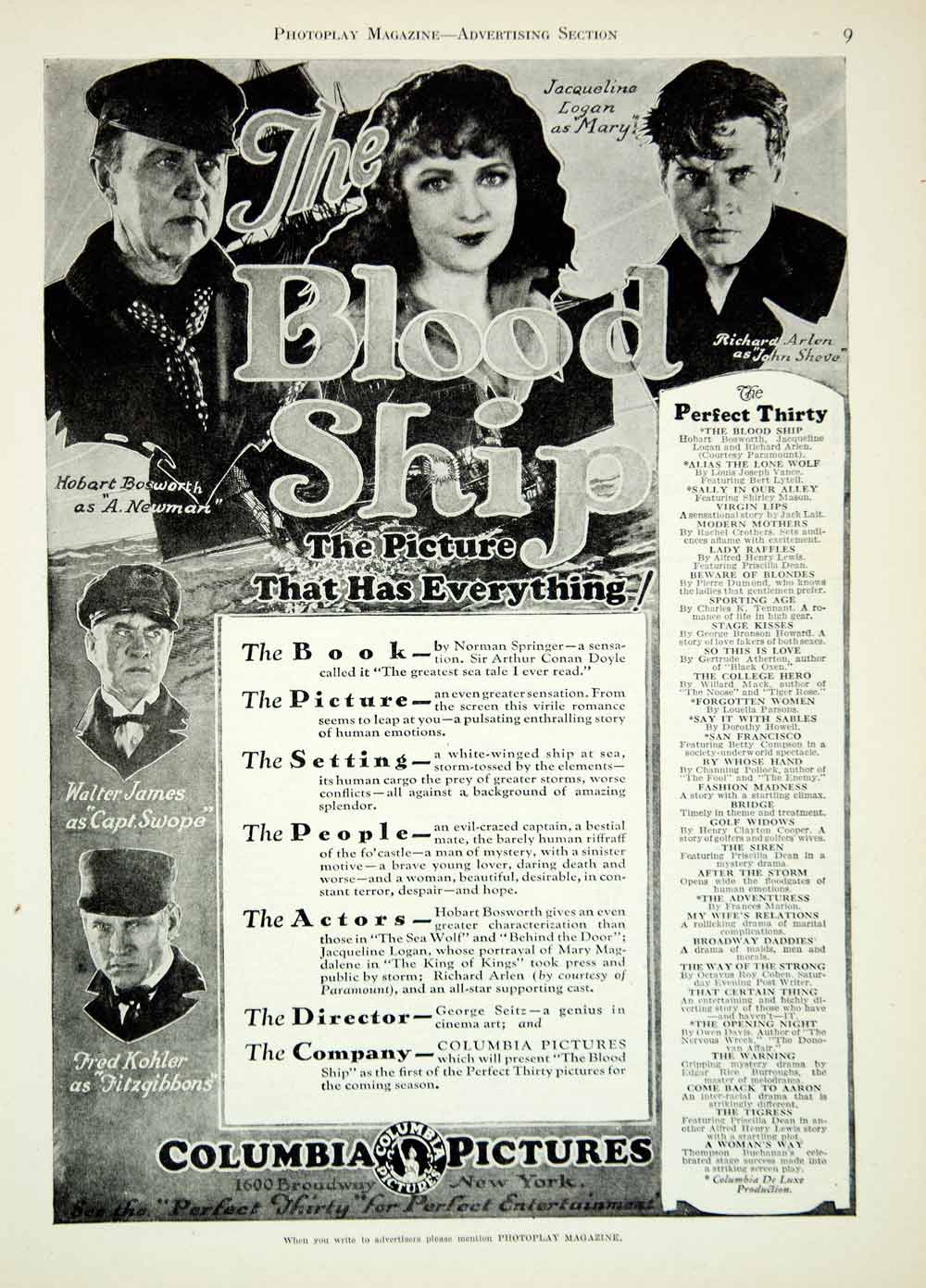 This is an original 1927 black and white print ad for the 1927 Columbia Pictures silent film "Blood Ship," directed by George B. Seitz and starring Hobart Bosworth, Jacqueline Logan, Richard Arlen, Walter James, and Fred Kohler; written by Fred Myton and Norman Springer. Produced by Harry Cohn. The ad also lists the Perfect Thirty Columbia Pictures movies for "Perfect Entertainment."