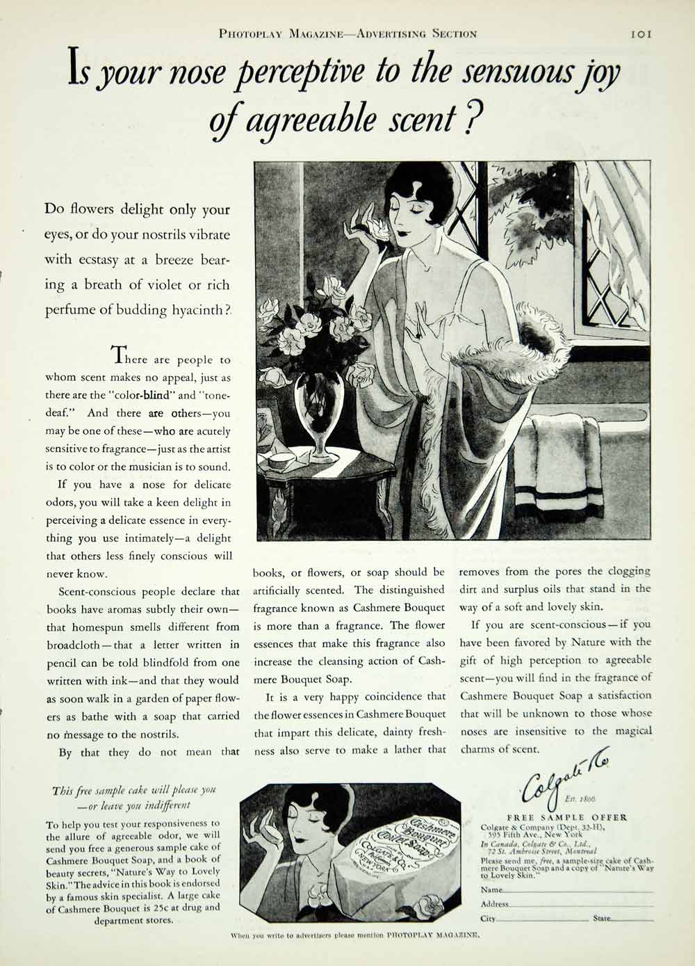 This is an original 1927 black and white print ad for Cashmere Bouquet Soap from Colgate & Company, 595 Fifth Avenue, NYC.