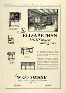 This is an original 1927 black and white print ad for Elizabethan motif dining room furniture from W. & J. Sloane, located on Fifth Avenue at 47th Street in New York.