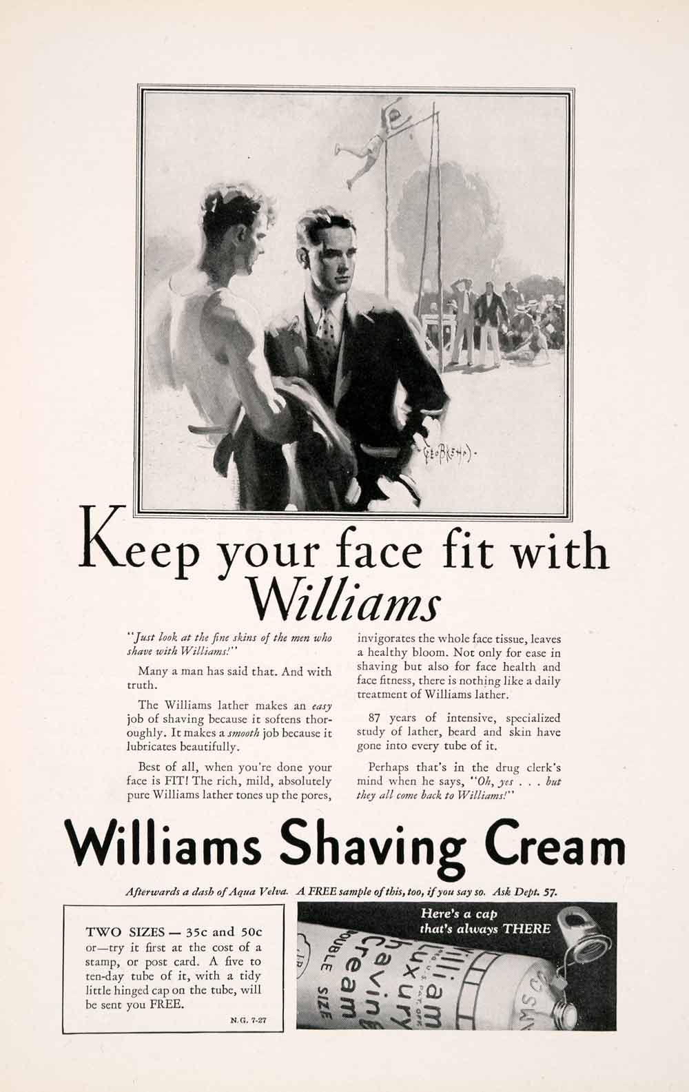 This is an original 1927 black and white print ad for Williams Shaving Cream. Seen in the image are two well dressed men at a pole vaulting match.