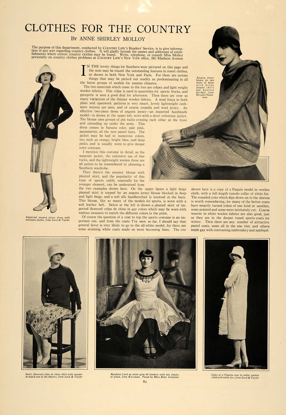 This is an original 1927 1 page article titled, "Clothes for the Country", by Anne Shirley Molloy. The article describes the clothing worn in resorts and in the South. The pieces are modeled by Miss Betty Compton.