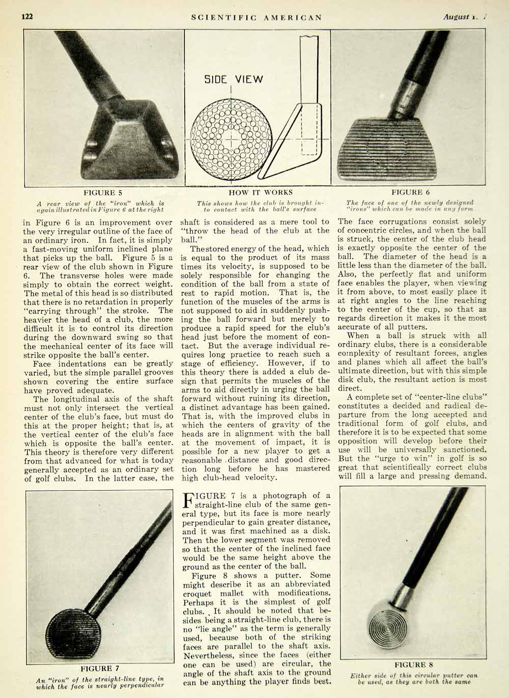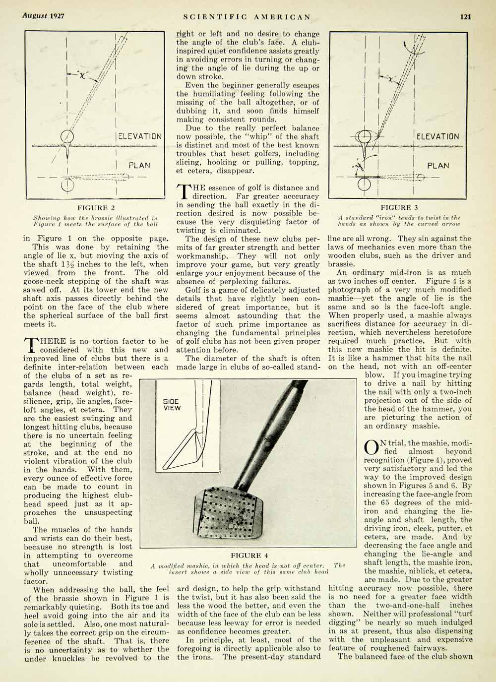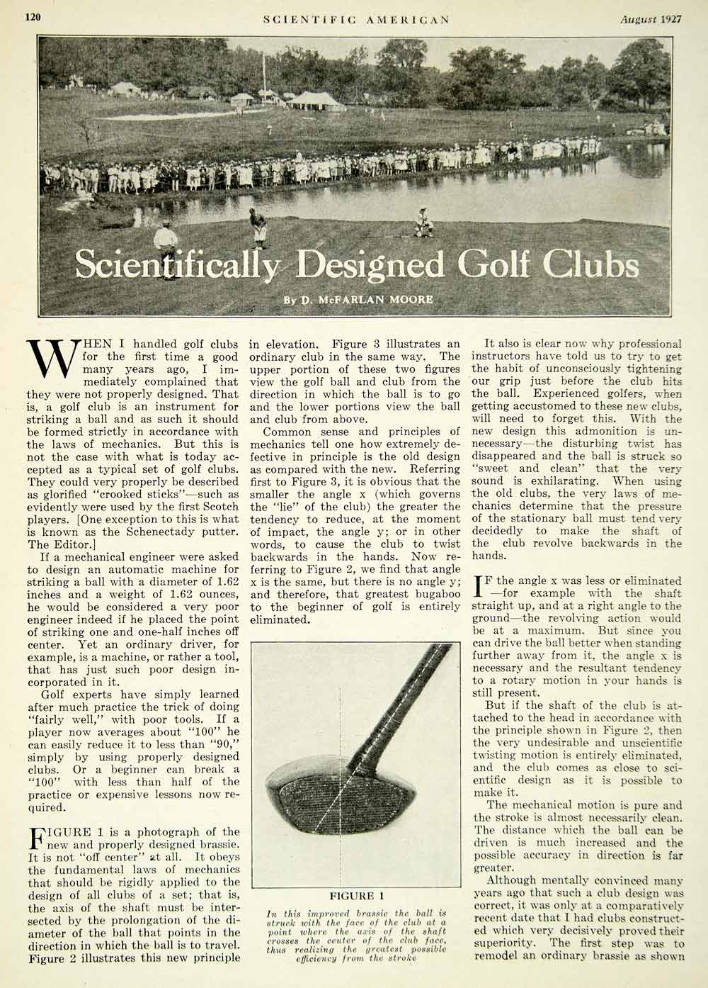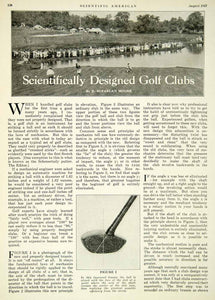 This is an original 1927 3 page black and white print article (two pages, one being double-sided) titled, "Scientifically Designed Golf Clubs," by McFarlan Moore. Please see additional images.