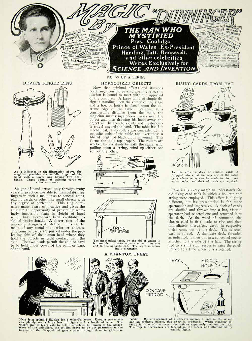 This is an original 1927 1 page black and white print article describing magic by Dunninger- the man who mystified President Coolidge, Prince of Wales, President Harding, President Taft, President Roosevelt as well as other celebrities.