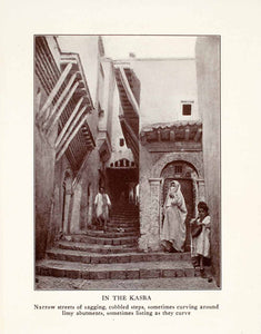 This is an original 1927 black and white halftone print of the narrow cobblestone streets in the city of Algiers in Africa.