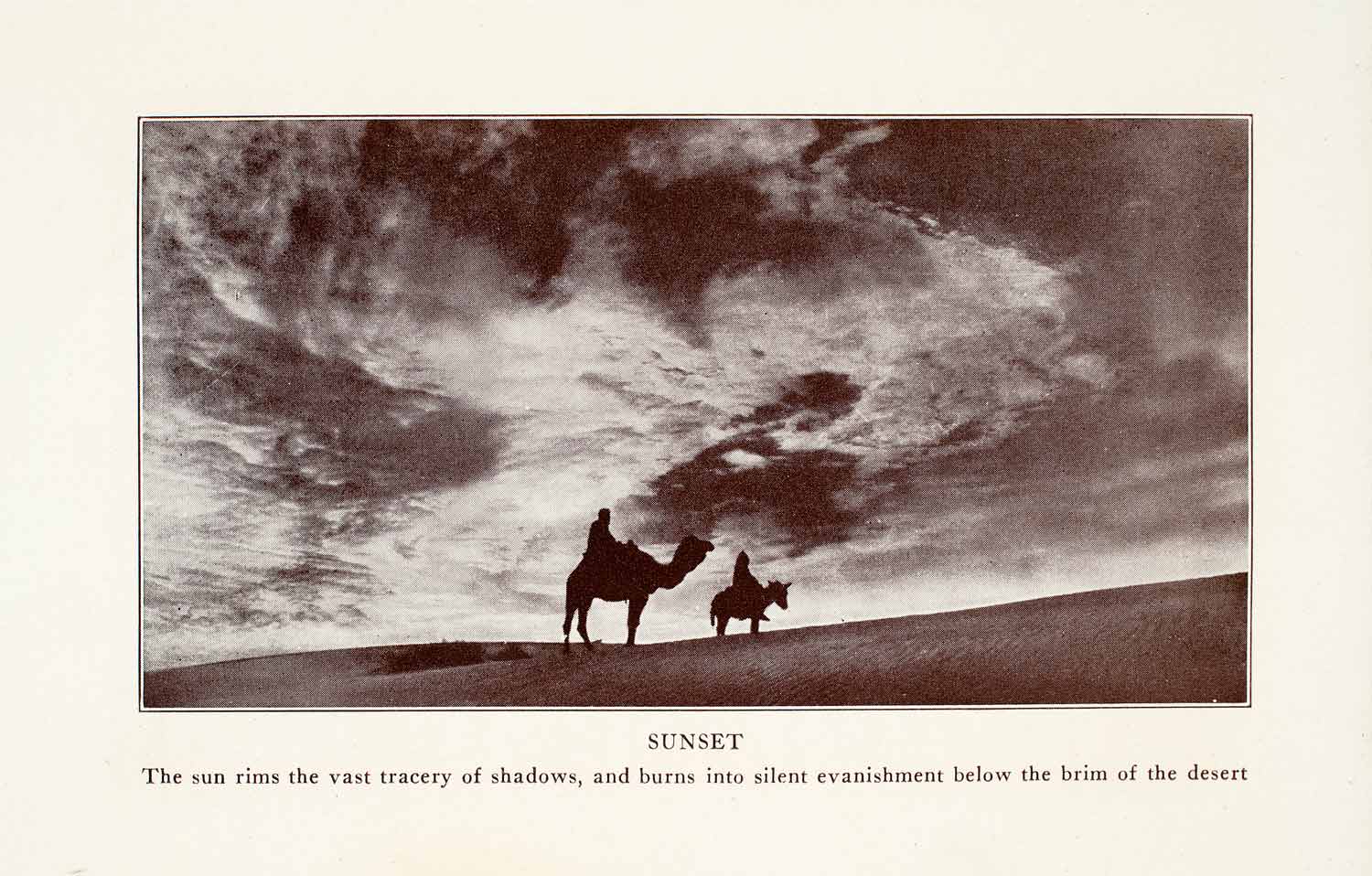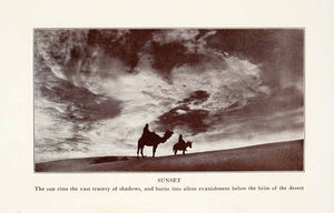This is an original 1927 black and white halftone print of Berber tribesmen astride camels and donkeys as they admire the brilliance of sunset in the Saharan desert near Algeria, Africa.