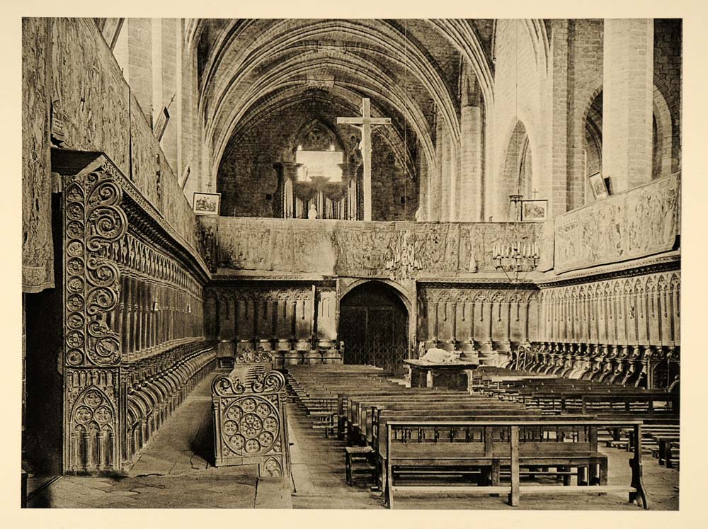 This is an original 1927 photogravure of the interior of the Church at La Chaise-Dieu, France (Frankreich, Francia). Photograph by Martin HŸrlimann. Please note that there is printing on the reverse.