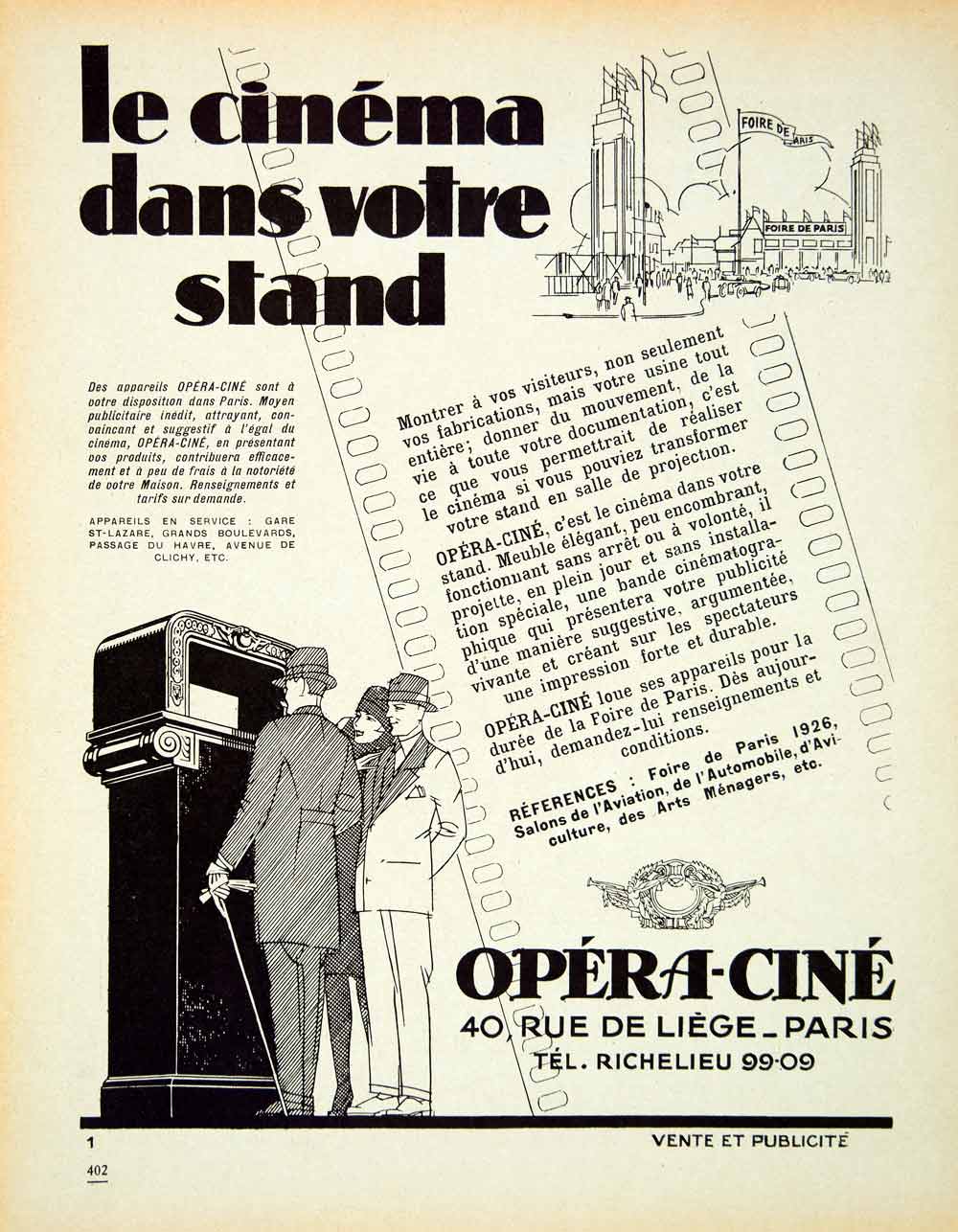 This is an original 1927 monochrome lithograph ad for the amazing advertising device produced by Opéra-Ciné. Although located at 40 rue de Liège, Paris, they were also lending their machines to booths at the Paris Fair.