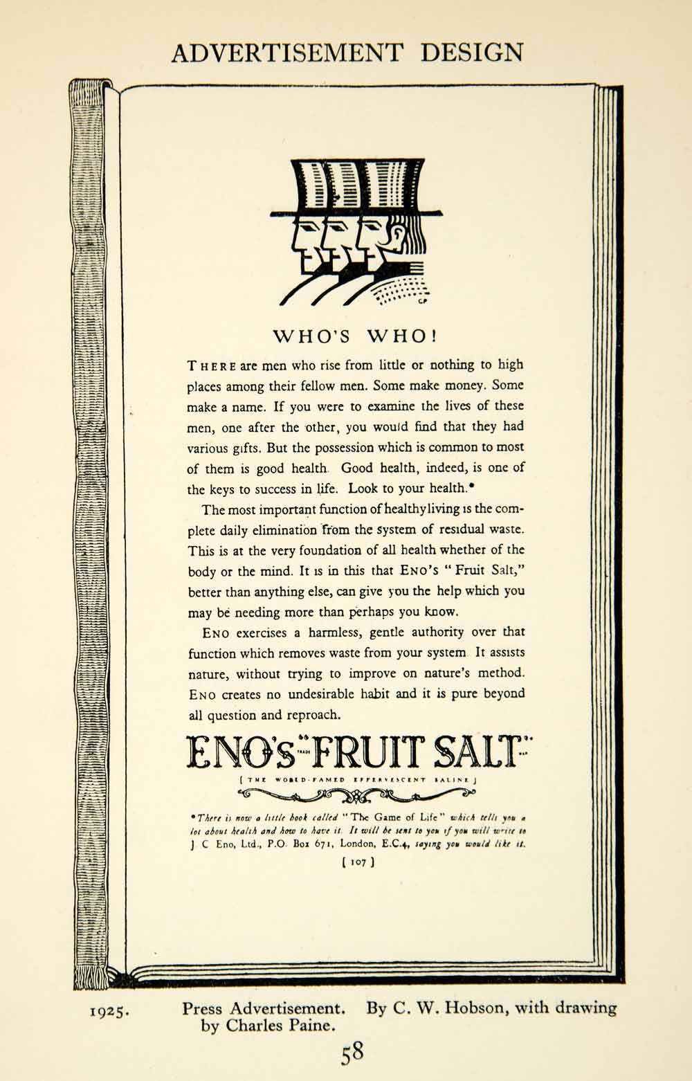 This is an original 1927 black and white offset lithograph of a press advertisement for Eno's "Fruit-Salt," by C.W. Hobson with illustration by Charles Paine.