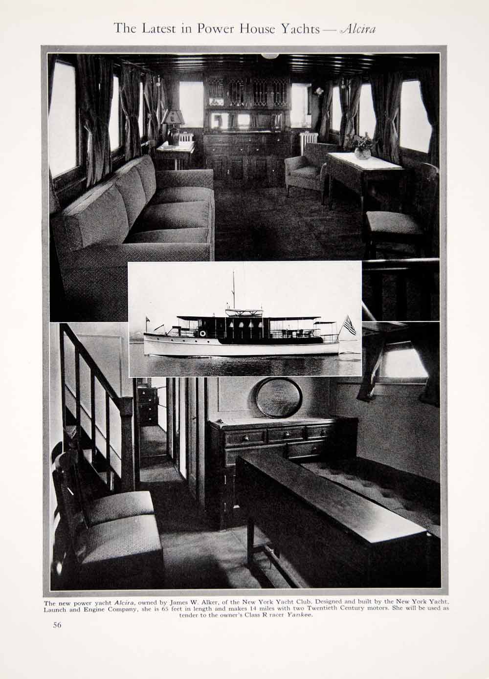 This is an original 1927 black and white halftone print of interior and exterior views of the 65-Foot Power Yacht, Alcira, that was designed and built by the New York Yacht Launch and Engine Company, and owned by James W. Alker during the Roaring Twenties era.