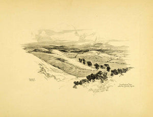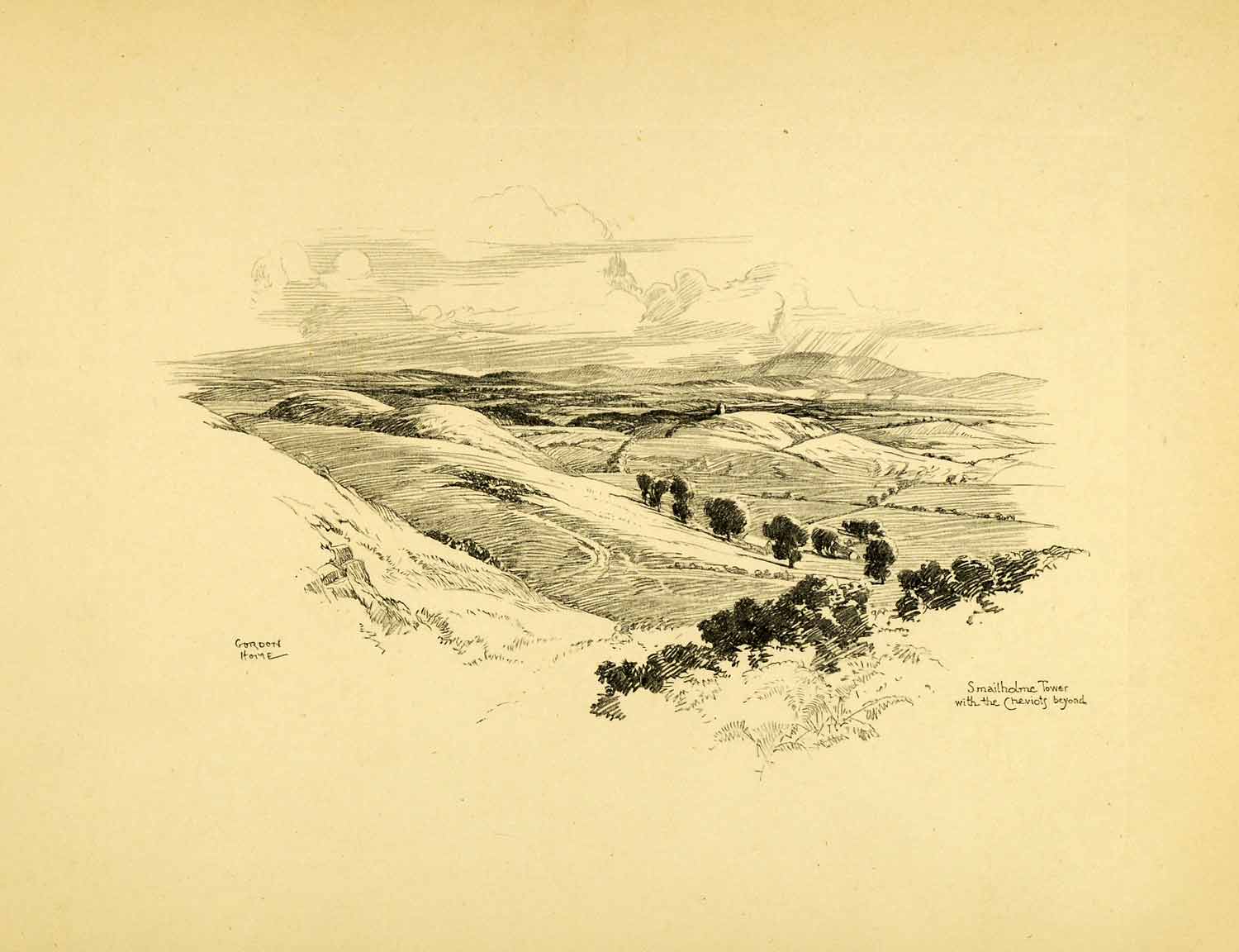 This is an original 1927 halftone print of a pencil drawing of the historic Smailholme Tower with a view of the Cheviot Hills in the distance. This historic ruin was erected in the 15th or early 16th century by the Pringle family. Today, it has been deemed a Scheduled Ancient Monument. This print features artwork by landscape artist, writer and illustrator Gordon Home.