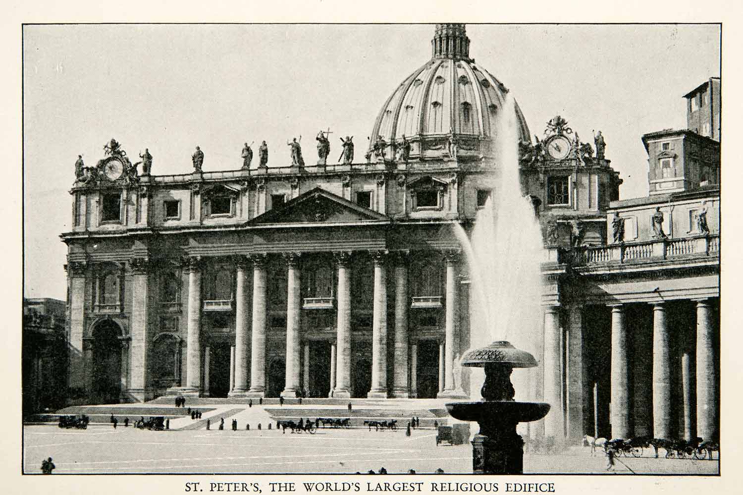 This is an original 1927 black and white halftone print of Basilica Papale di San Pietro in Vaticano (The Papal Basilica of Saint Peter in the Vatican City.