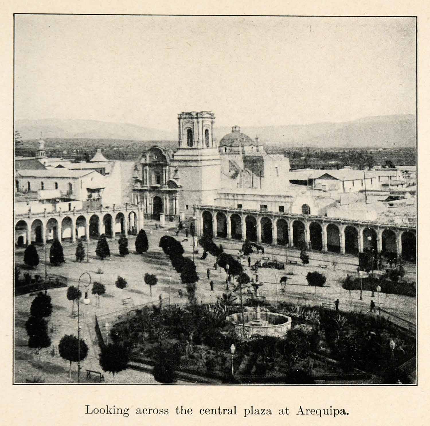This is an original 1927 halftone print of a view of Arequipa, Peru looking across the central plaza. It shows the architecture of the time and well planned landscaping of the plaza.