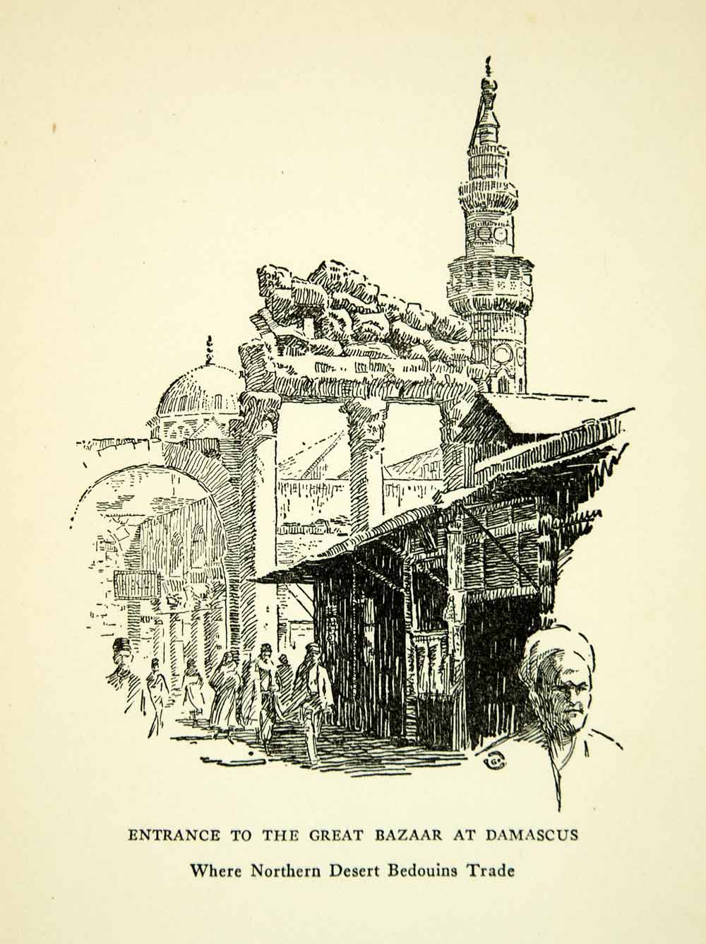 This is an original 1927 black on cream stock relief line-block print of a pen drawing, by Anna Gladys Smith, of the entrance to the Great Bazaar in Damascus, Syria.