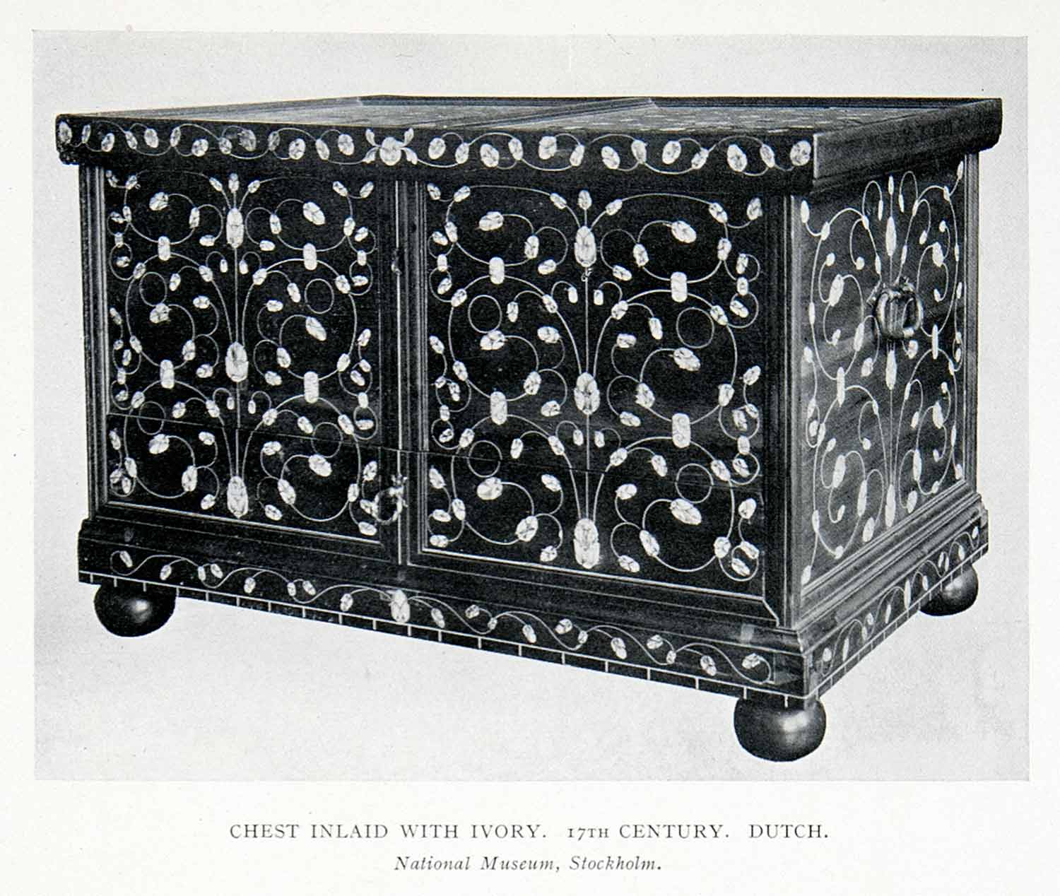 This is an original 1927 black and white halftone print of a Dutch inlaid chest from the 17th Century that was housed in the National Museum in Stockholm.