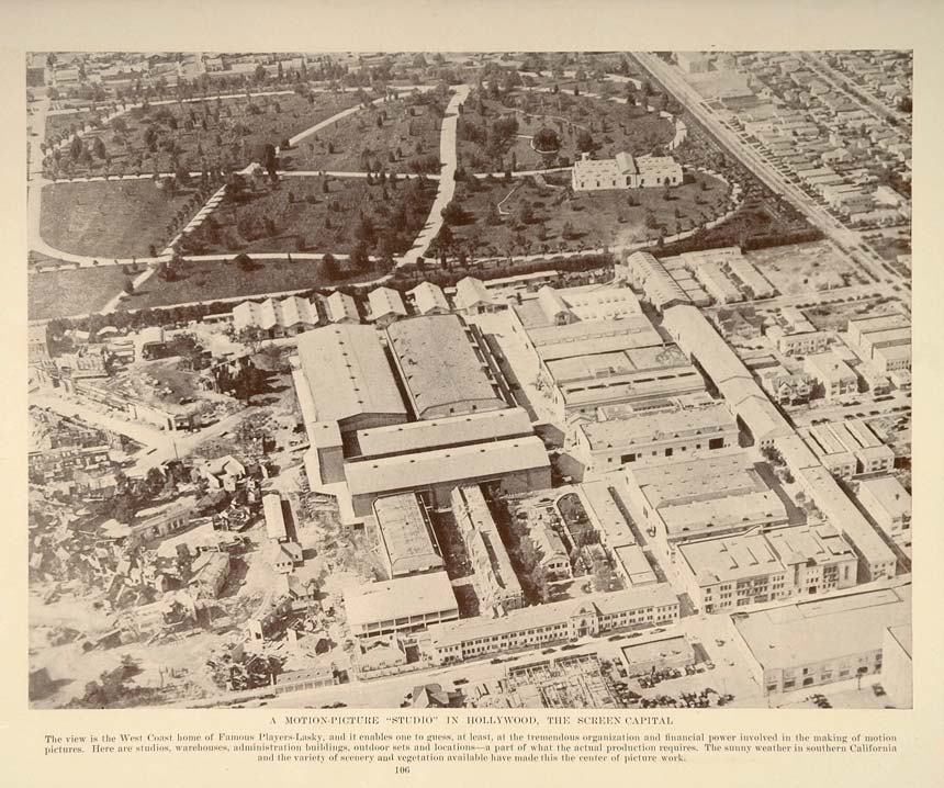 This is an original 1927 print of a bird's eye view of the Famous Players-Lasky studio in Hollywood. This motion picture company was formed in 1916 from the merger of Famous Players Film Company and the Jesse L. Lasky Feature Play Company.