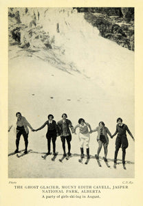 This is an original 1927 halftone print of girls skiing on the Ghost Glacier of Mount Edith Cavell in the Jasper National Park of Alberta, Canada.
