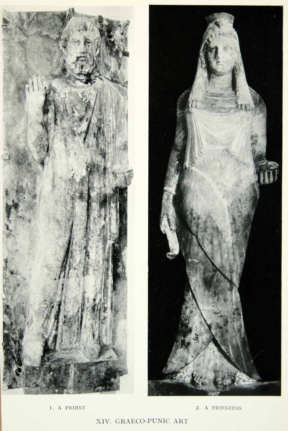 This is an original 1927 black and white halftone print of a pair of Graeco-Punic marble sarcophagus sculptures from an archeological site that depicted an ancient Greek priest and priestess in ceremonial dress.