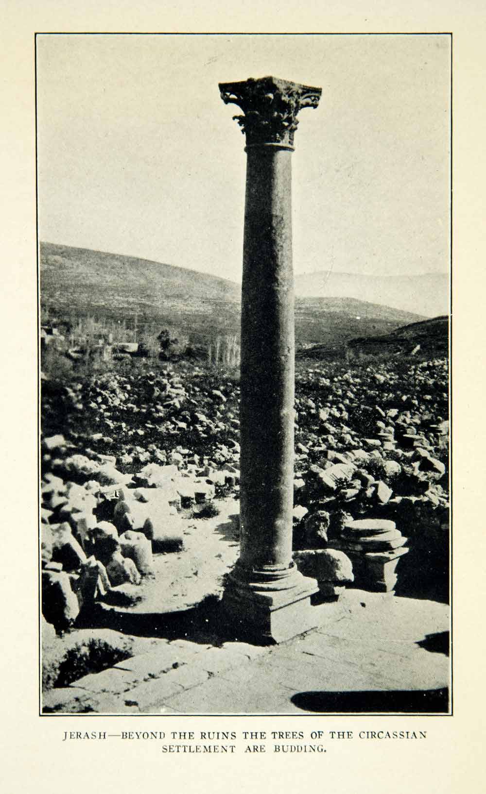 This is an original 1927 black and white halftone print of Jerash, Jordan. Beyond the ruins are budding trees in the Circassian settlement.