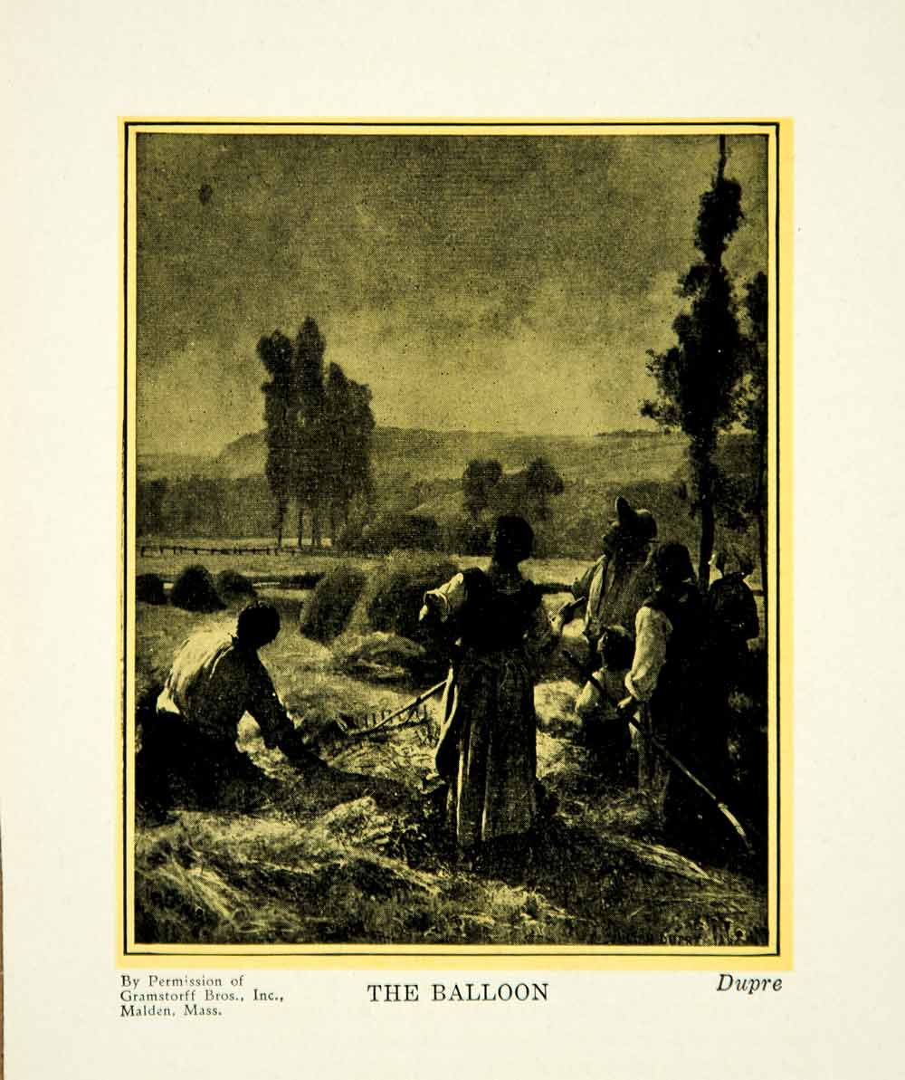 This is an original 1927 two-color halftone print of a Realism style painting by Julien Dupré (1851-1910) entitled "Le Ballon" that portrayed a group of French peasant farmers working in the fields staring up at a hot air balloon in the sky.