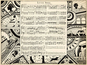 This is an original 1927 black and white relief line-block print of the words and music to the traditional African-American folk song "Levee Song."