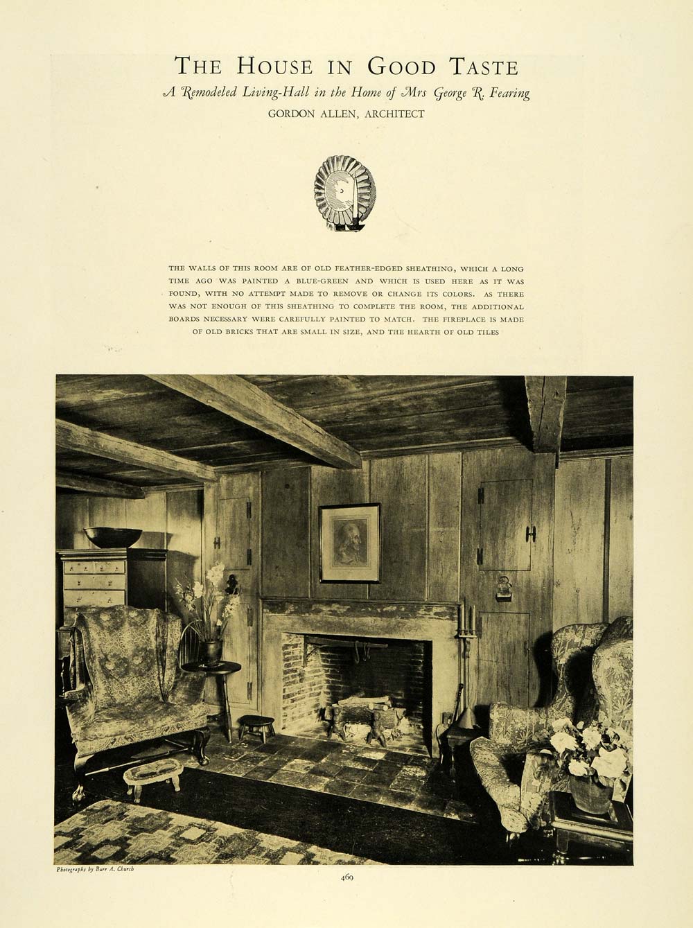 This is an original 1927 halftone print of the remodeled living room of George R. Fearing, featuring architecture by Gordon Allen. Photography courtesy of Burr A. Church.
