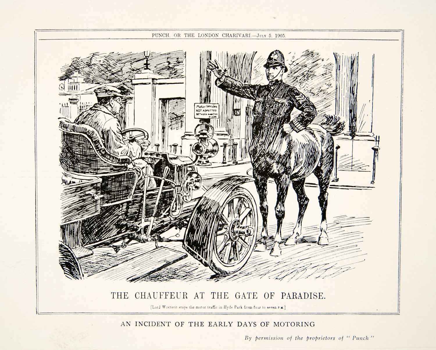 This is an original 1927 black and white relief line-block print of "The Chauffeur at the Gate of Paradise. Lord Windsor Stops the Motor Traffic in Hyde Park from Four to Seven P. M. An Incident in the Early Days of Motoring." The original cartoon had appeared in the