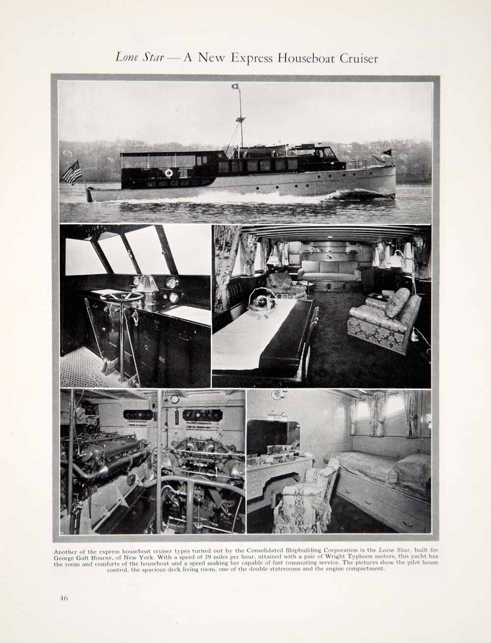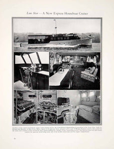 This is an original 1927 black and white halftone print of interior and exterior views of the express houseboat cruiser, Lone Star, that was built by the Consolidated Shipbuilding Corporation and owned by George Galt Bourne of New York during the Roaring Twenties era.