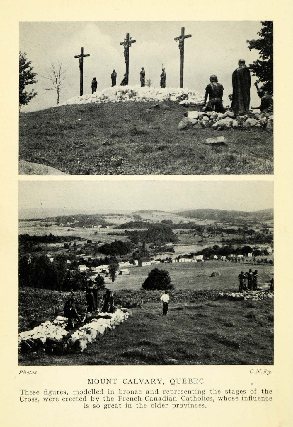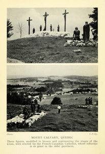 This is an original 1927 halftone print of crosses located at Mount Calvary, Quebec, Canada. The caption writes, "These figures, modelled in bronze and representing the stages of the Cross, were erected by the French Canadian Catholics, whose influence is so great in the older provinces."