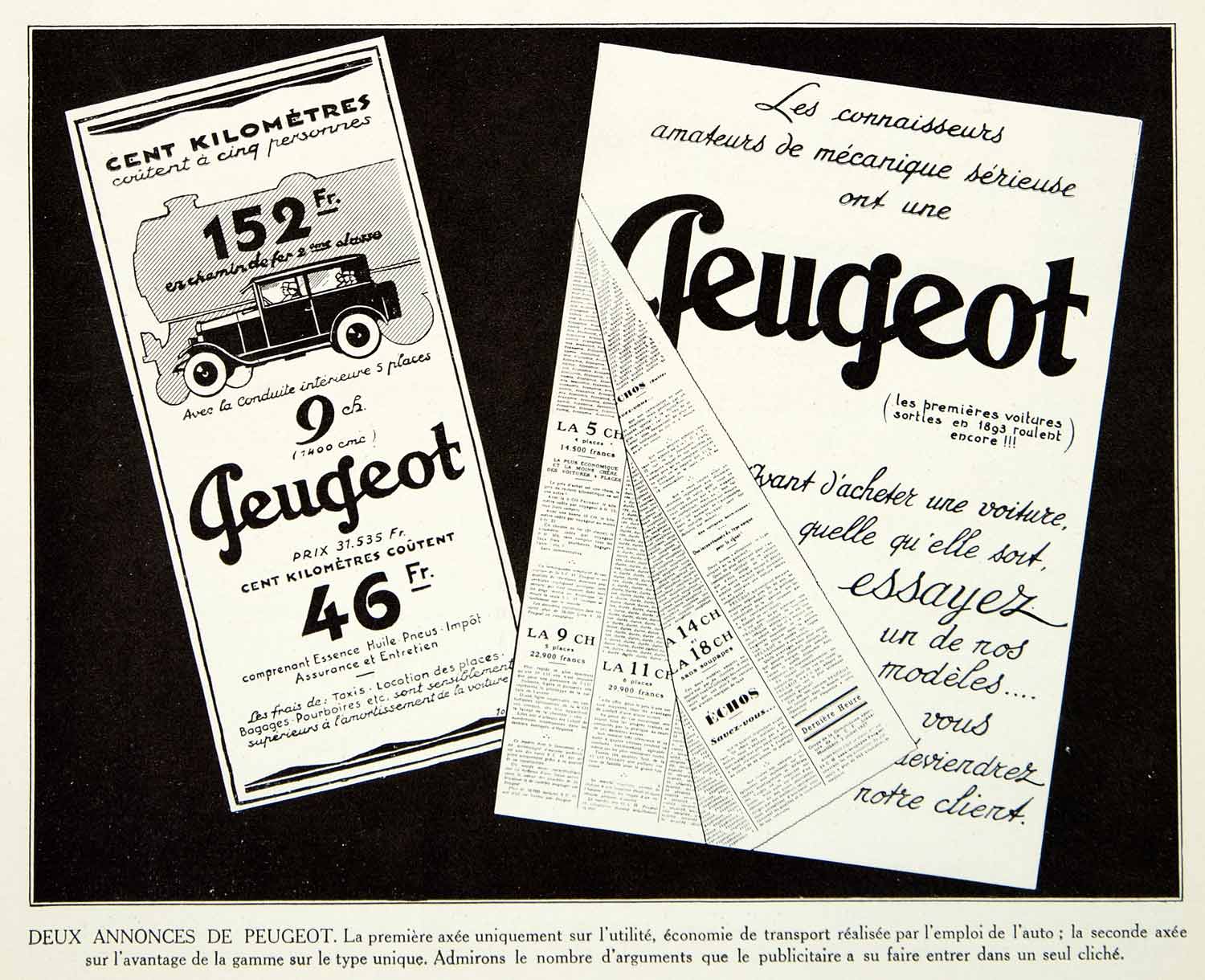 This is an original 1927 black and white halftone print of two different French advertisements for Peugeot automobiles.
