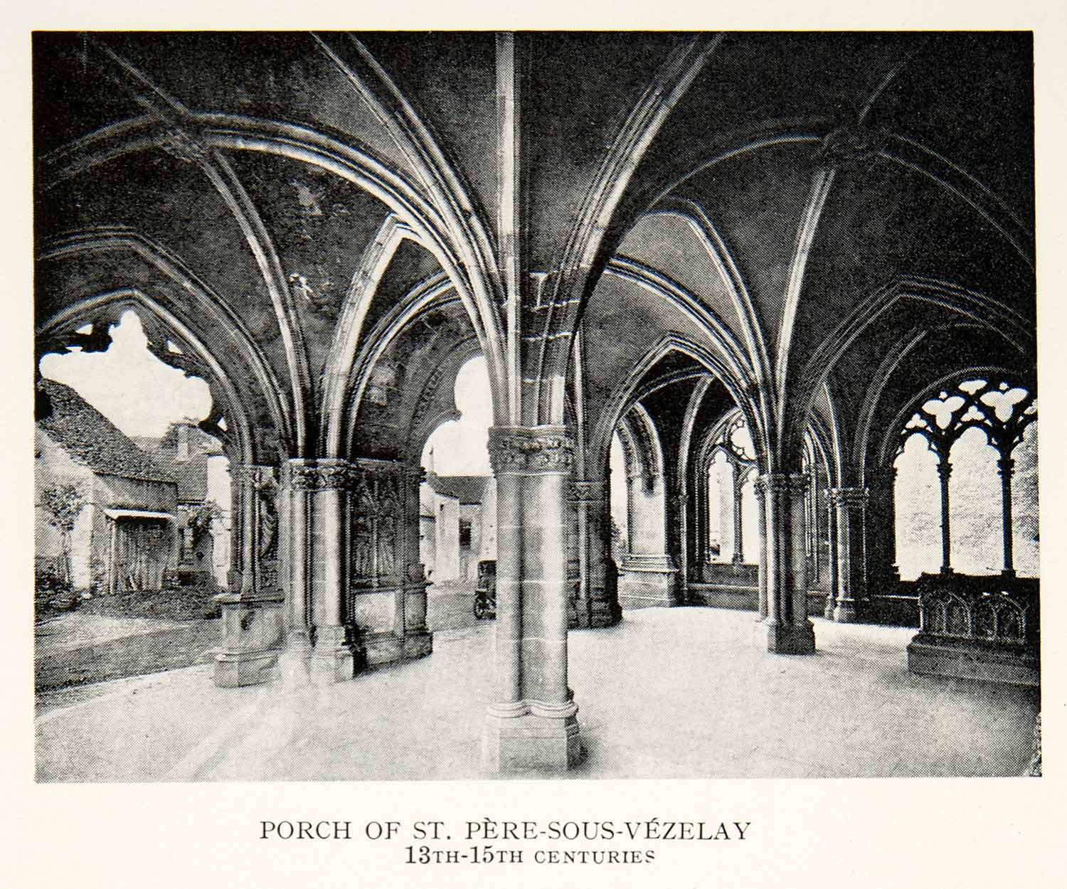 This is an original 1927 black and white halftone print of the porch of Saint Père-Sous-Vézelay which is located in the town of Vézelay in the Yonne department of Burgundy, France. It was begun in the 13th century.