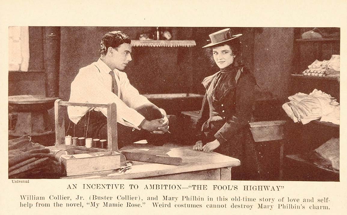 This is an original 1927 print of a scene from Irving Cummings's The Fool's Highway (1924) with Mary Philbin as Mamie Rose, Pat O'Malley as Mike Kildare, and William Collier Jr. as Max Davidson.