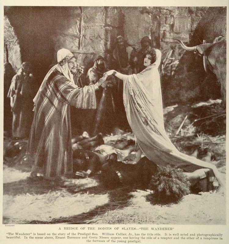 This is an original 1927 print of a scene from Raoul Walsh's The Wanderer (1925) with William Collier Jr. as Jether, Ernest Torrence as Tola, Greta Nissen as Tisha, and Wallace Beery as Pharis.