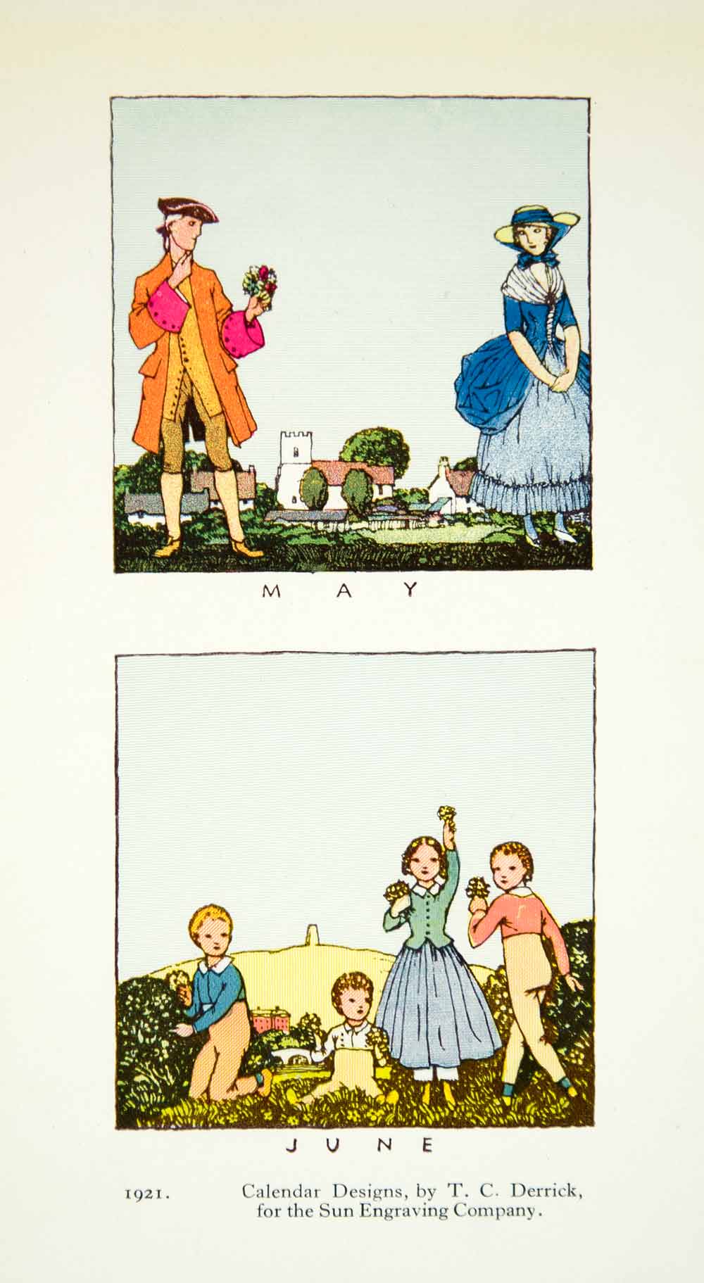 This is an original 1927 color relief line-block print of calendar designs, by T.C. Derrick for the Sun Engraving Company.