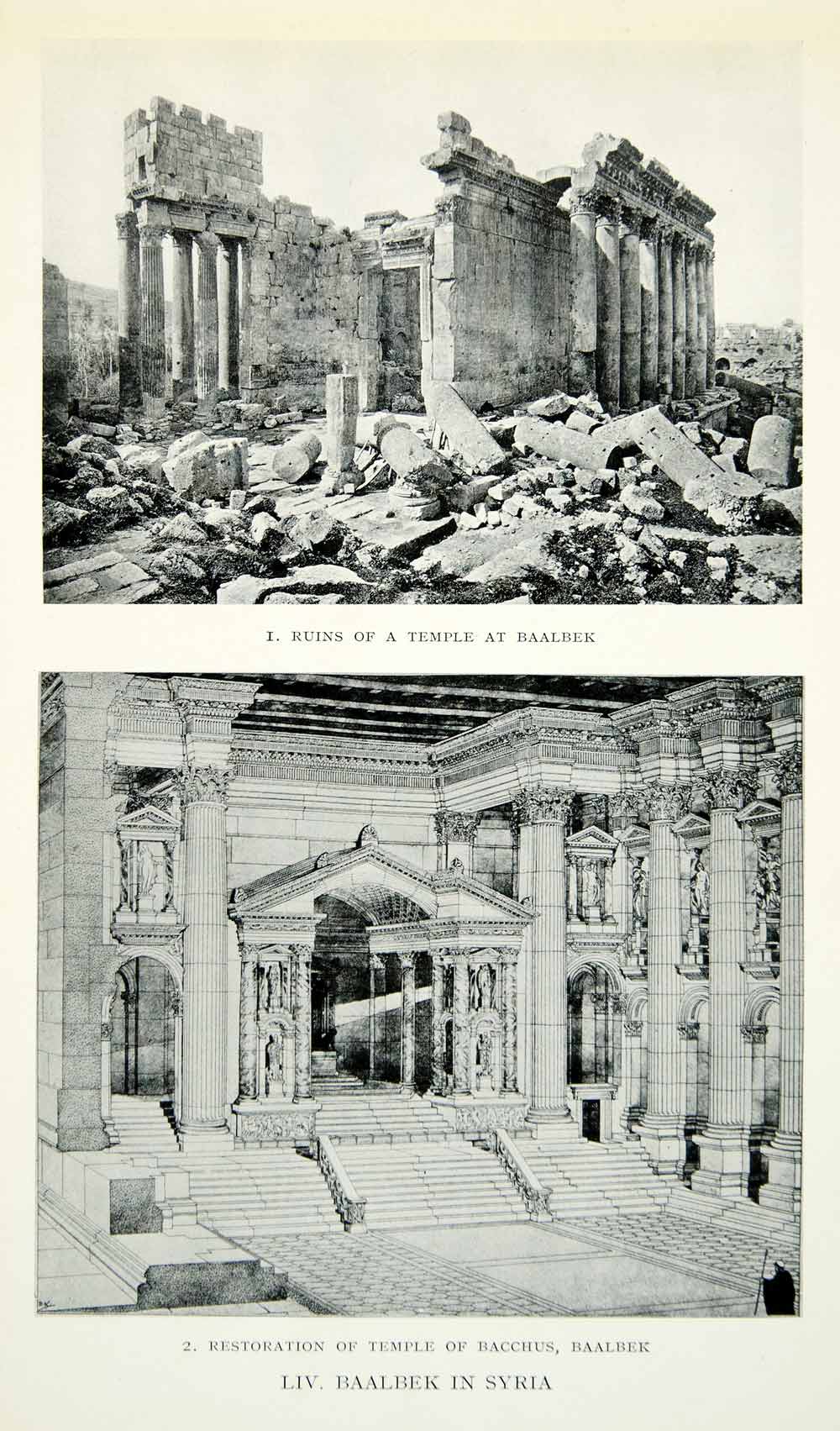 This is an original 1927 black and white halftone print of the ancient Roman ruins of the Temple of Jupiter in Baalbek (Heliopolis), Syria and a "restoration" of the Temple of Bacchus that is based on archeological excavations of the area.
