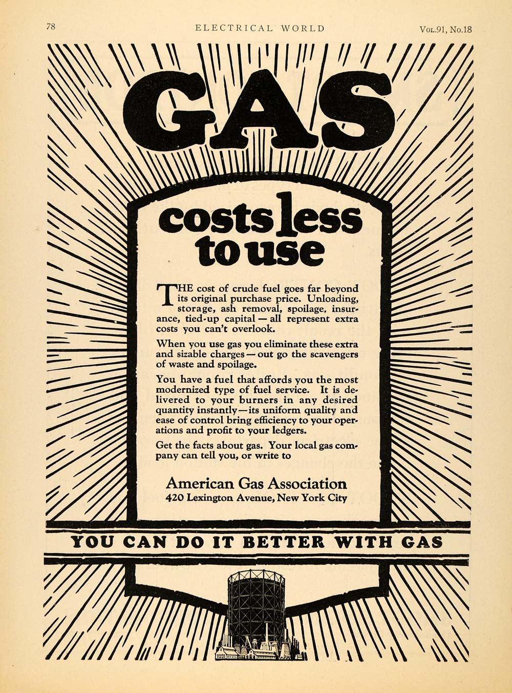 This is an original 1928 black and white print ad for the American Gas Association located at 420 Lexington Avenue, New York.