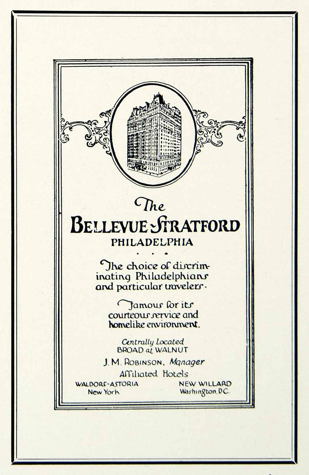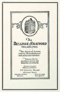 This is an original 1928 black and white print ad for the Bellevue-Stratford Hotel that was located at Broad and Walnut Streets in Philadelphia, Pennsylvania.
