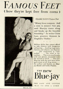 This is an original 1928 black and white print ad for Blue Jay Bunion and Callus Plasters featuring Claire Luce who danced in Ziegfeld's "Follies."