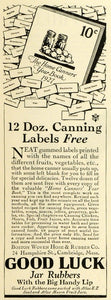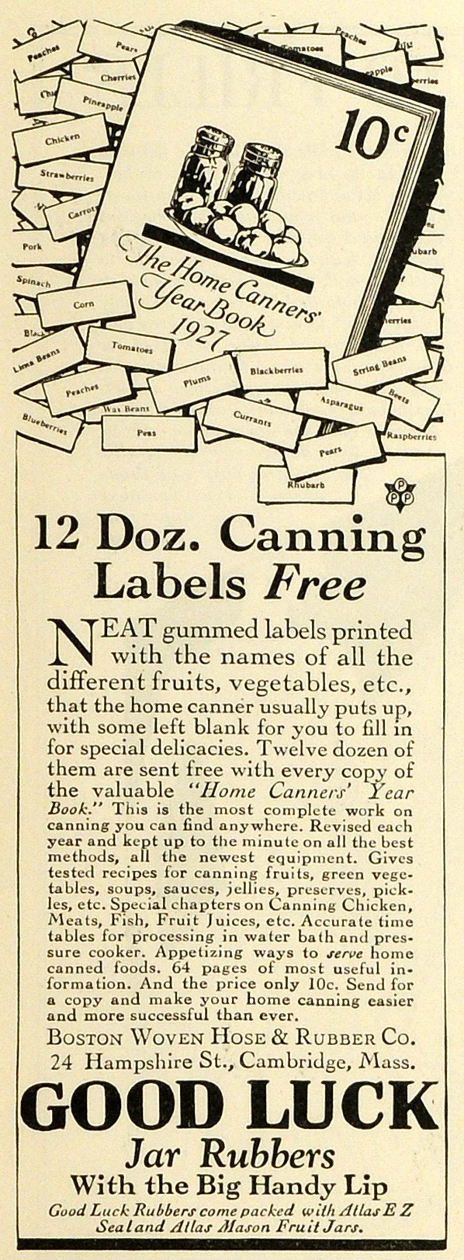 This is a small original 1928 black and white print ad for the Good Luck Jar Rubbers from Boston Woven Hose & Rubber Company located at 24 Hampshire Street, Cambridge, Massachusetts.