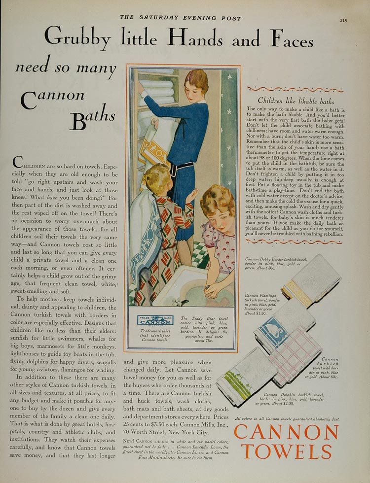 This is an original 1928 color print ad for Cannon Towels with illustrations of the Teddy Bear towel; the Cannon Dobby Border Turkish towel; the Cannon Flamingo Turkish towel; and the Cannon Dolphin Turkish towel. Plus the ad gives interesting advice on the way to get children to like baths.