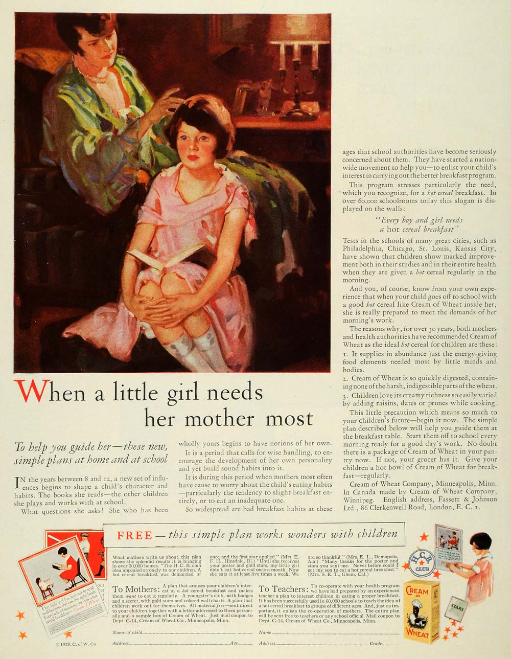 This is an original 1928 color print ad for the hot cereal Cream of Wheat, by the Cream of Wheat Company of Minneapolis, Minnesota.